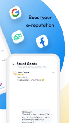 The Partoo application, an all-in-one local marketing platform, allows you to: Manage your photos and opening hours Get a notification every time you receive a new review on Google, Facebook or TripAdvisor and reply quickly with customised templates Collect new reviews via SMS invitations or QR codes Chat with your customers on the most popular messaging platforms (Google, Messenger and Instagram)